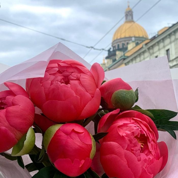 Лента – 2 шт.Пион – 5 шт.Упаковка дизайнерская – 2 шт.