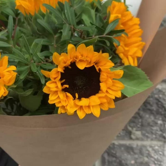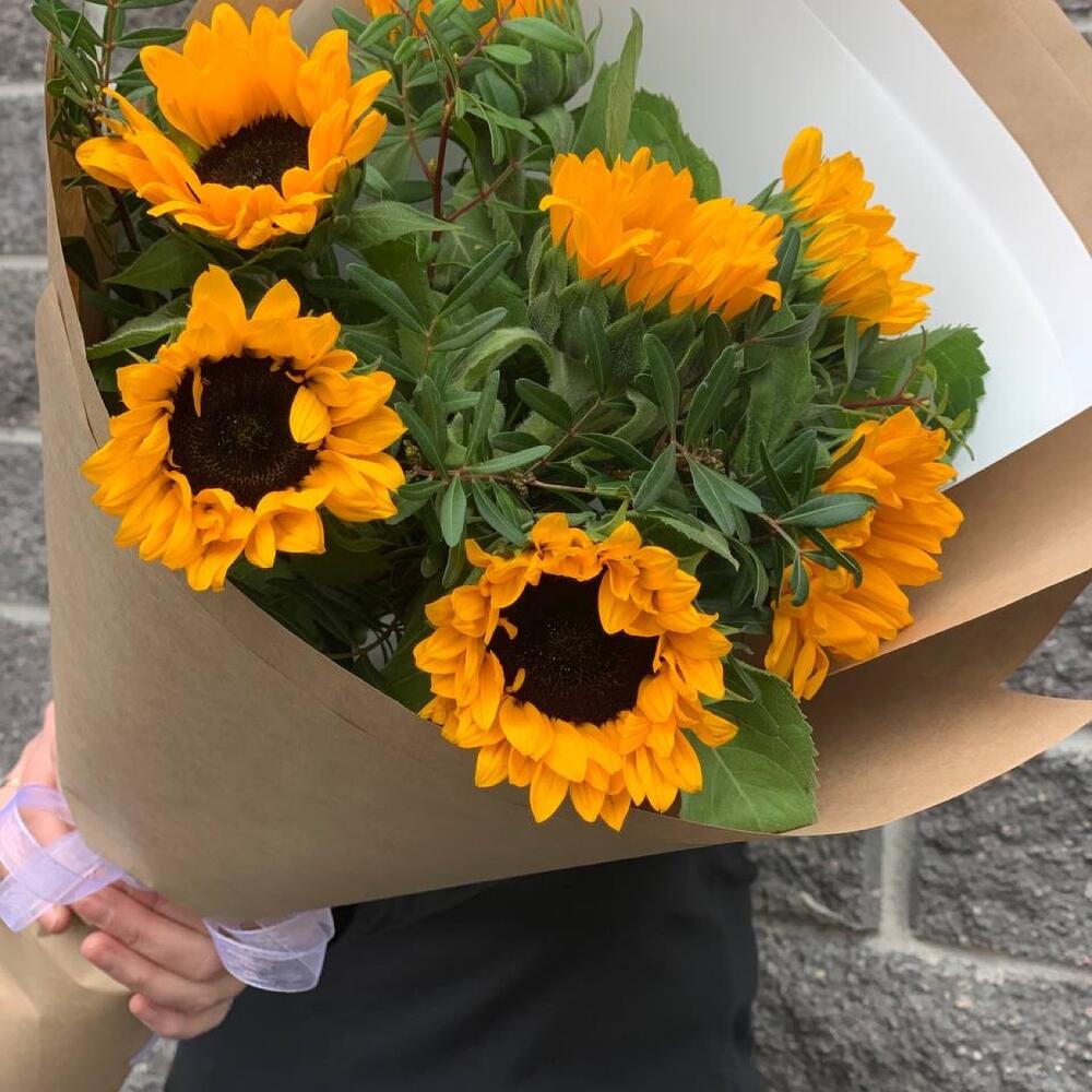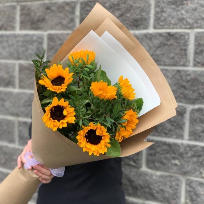 Подсолнух – 7 шт.Зелень – 5 шт.Крафт упаковка – 1 шт.Лента атласная – 1 шт.