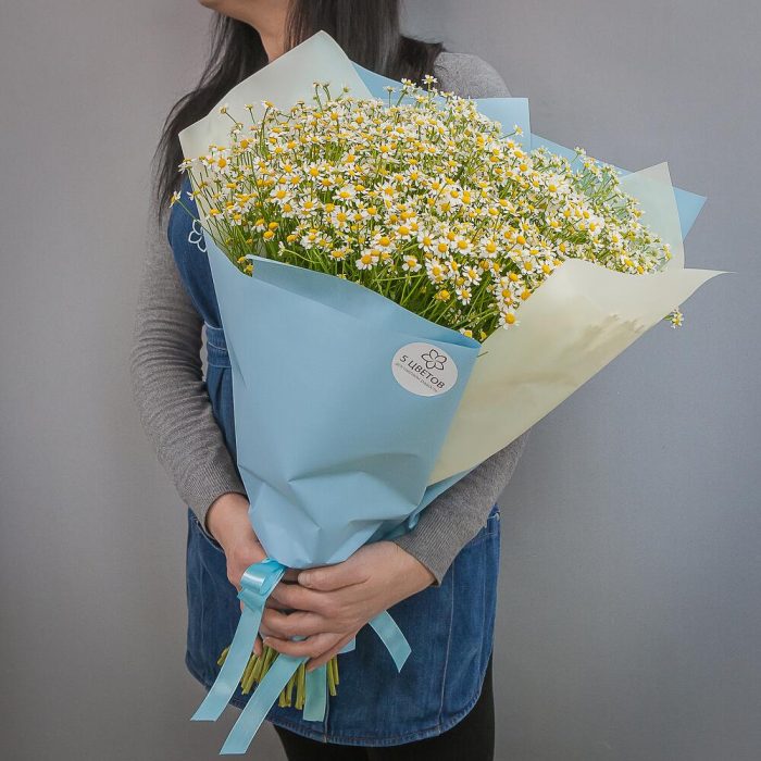 ромашки – 101 шт.дизайнерская упаковка и атласная лента – 1 шт.