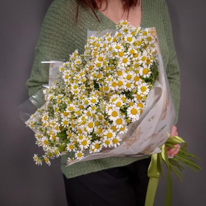 Ромашка кустовая – 21 шт.Упаковка дизайнерская – 1 шт.Аквапак – 1 шт.Средство для продления жизни цветов – 2 шт.
