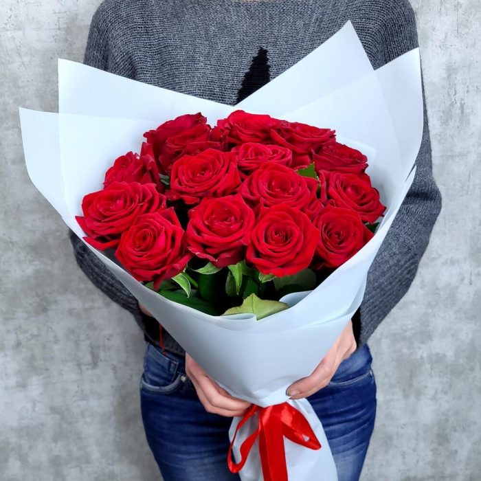 15 красных роз в блестящей упаковке