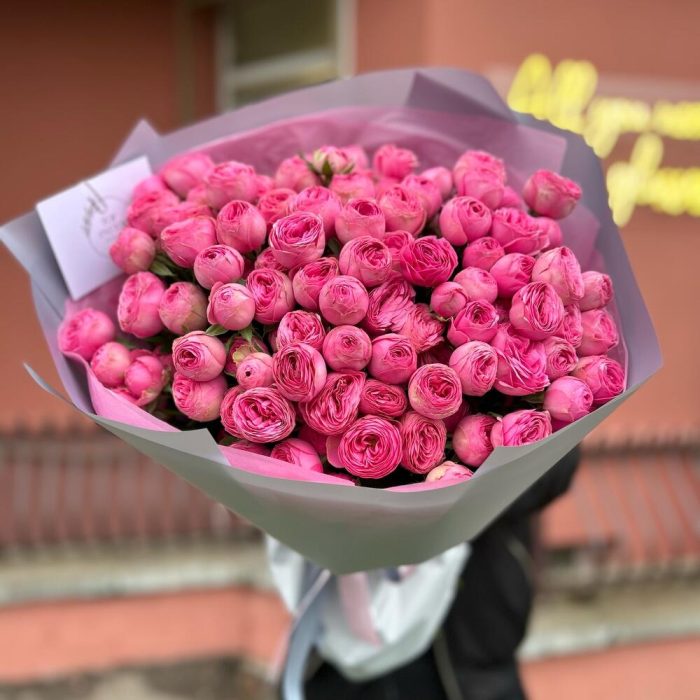 Тишью – 1 шт. Атласная лента – 1 шт. Кустовая пионовидная роза – 25 шт. Дизайнерская упаковка – 1 шт.