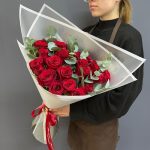 Эвкалипт – 7 шт.Атласная лента – 1 шт.Роза Эквадор 60 см – 21 шт.Дизайнерская упаковка – 1 шт.