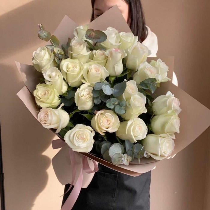 Шляпная коробка из 25 белых роз "Мондиаль"