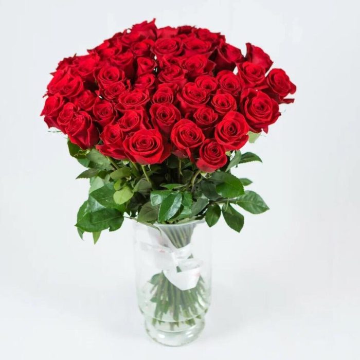 Роза красная – 51 шт.Лента атласная – 1 шт.Пленка прозрачная – 1 шт.