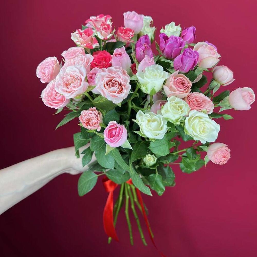 кустовая роза микс – 7 шт.Лента – 1 шт.
