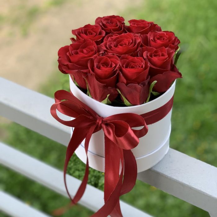 Роза – 9 шт.Коробка – 1 шт.бант атласный – 1 шт.