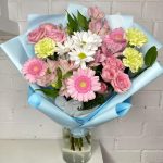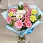 Гербера – 3 шт.Альстромерия – 3 шт.Диантус – 3 шт.Роза кустовая – 2 шт.Фисташка – 3 шт.Корейская упаковка – 3 шт.