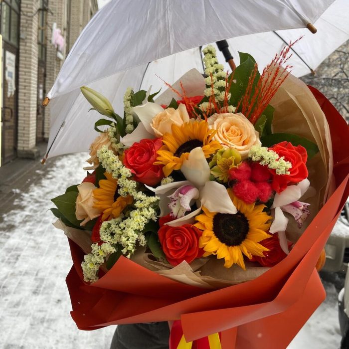 Альстромерия – 1 шт.Орхидея Цимбидиум – 3 шт.Статица – 3 шт.Роза Россия – 9 шт.Подсолнух – 3 шт.Пленка матовая – 6 шт.Салал пучок – 1 шт.сухоцвета – 10 шт.
