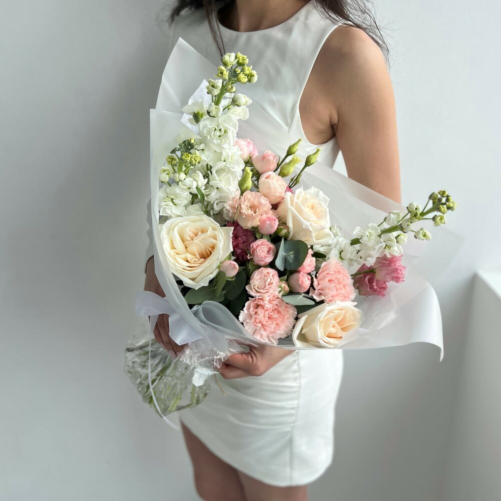 Маттиола – 3 шт.Эвкалипт – 3 шт.Кустовая роза – 2 шт.Гвоздика – 3 шт.Эустома – 1 шт.Садовая роза – 3 шт.
