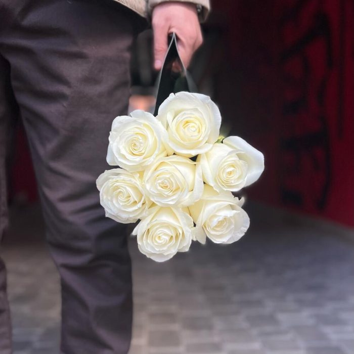 Роза белая – 7 шт.Лента органза – 1 шт.переноска конус – 1 шт.