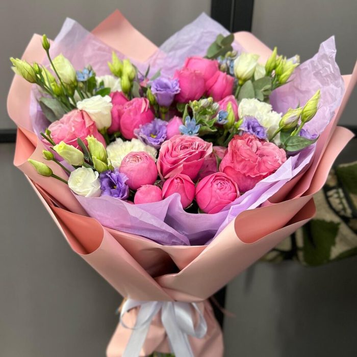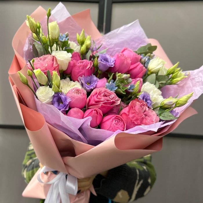 Эвкалипт – 3 шт.Лента атласная – 2 шт.Оксипеталум – 3 шт.Диантус одноголовый – 3 шт.Пленка матовая – 3 шт.эустома розита вайт – 1 шт.роза country blues 50 см – 3 шт.роза кустовая сильва пинк – 4 шт.эустома махровая лавандовая – 2 шт.