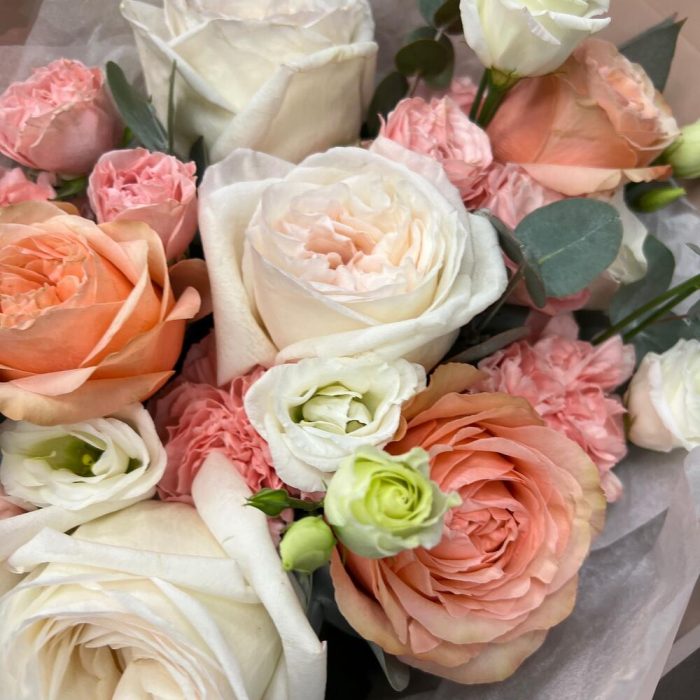 роза пионовидная вайт o’hara – 3 шт.Роза пионовидная кахала – 3 шт.Мадам бомбастик – 2 шт.Диантус одноголовый – 3 шт.эустома розита вайт – 2 шт.Эвкалипт – 3 шт.Пленка матовая – 5 шт.Тишью – 1 шт.Лента атласная – 2 шт.