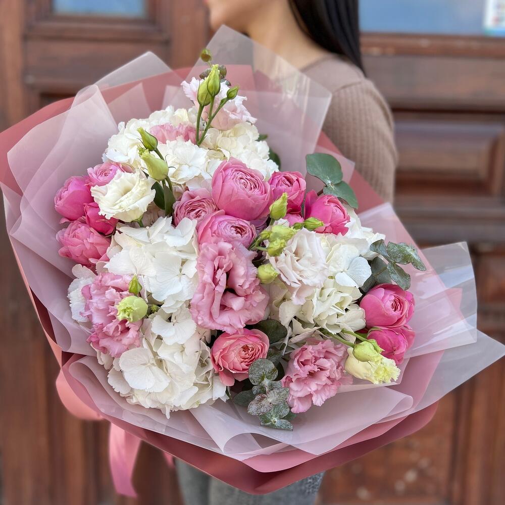 Гортензия – 3 шт.Эвкалипт – 3 шт.Лента атласная – 2 шт.Пленка матовая – 6 шт.эустома махровая розовая – 2 шт.роза пионовидная сильва пинк – 5 шт.