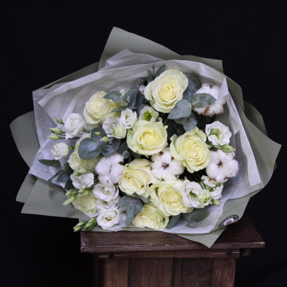 Роза Мондиаль – 9 шт.Эустома – 5 шт.Хлопок натуральный – 4 шт.Эвкалипт – 3 шт.Тишью – 2 шт.Пленка дизайнерская – 3 шт.Лента атласная – 2 шт.