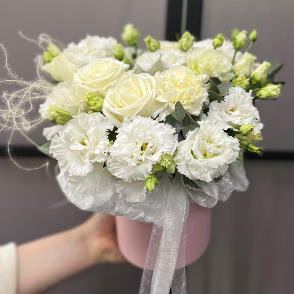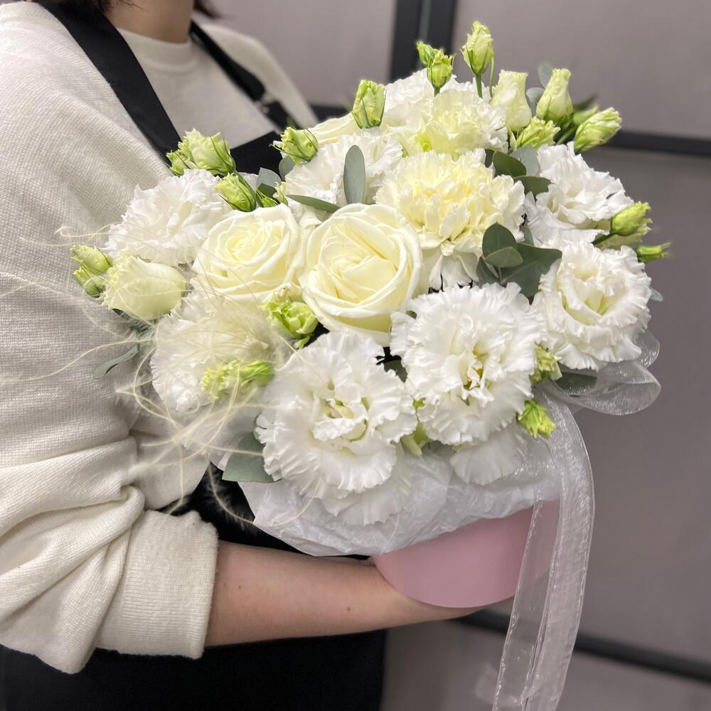 роза пионовидная плайя бланка – 3 шт.эустома махровая белая – 3 шт.Диантус – 3 шт.Эвкалипт – 2 шт.Оазис флористический – 1 шт.Коробка шляпная – 1 шт.Лента атласная – 2 шт.Тишью – 1 шт.Ковыль – 1 шт.