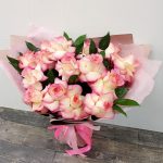 Букет 15 розовых роз и 20 белых альстромерий