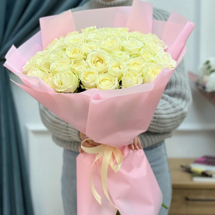 Лента атласная – 1 шт.Пленка матовая – 3 шт.Роза белая – 51 шт.