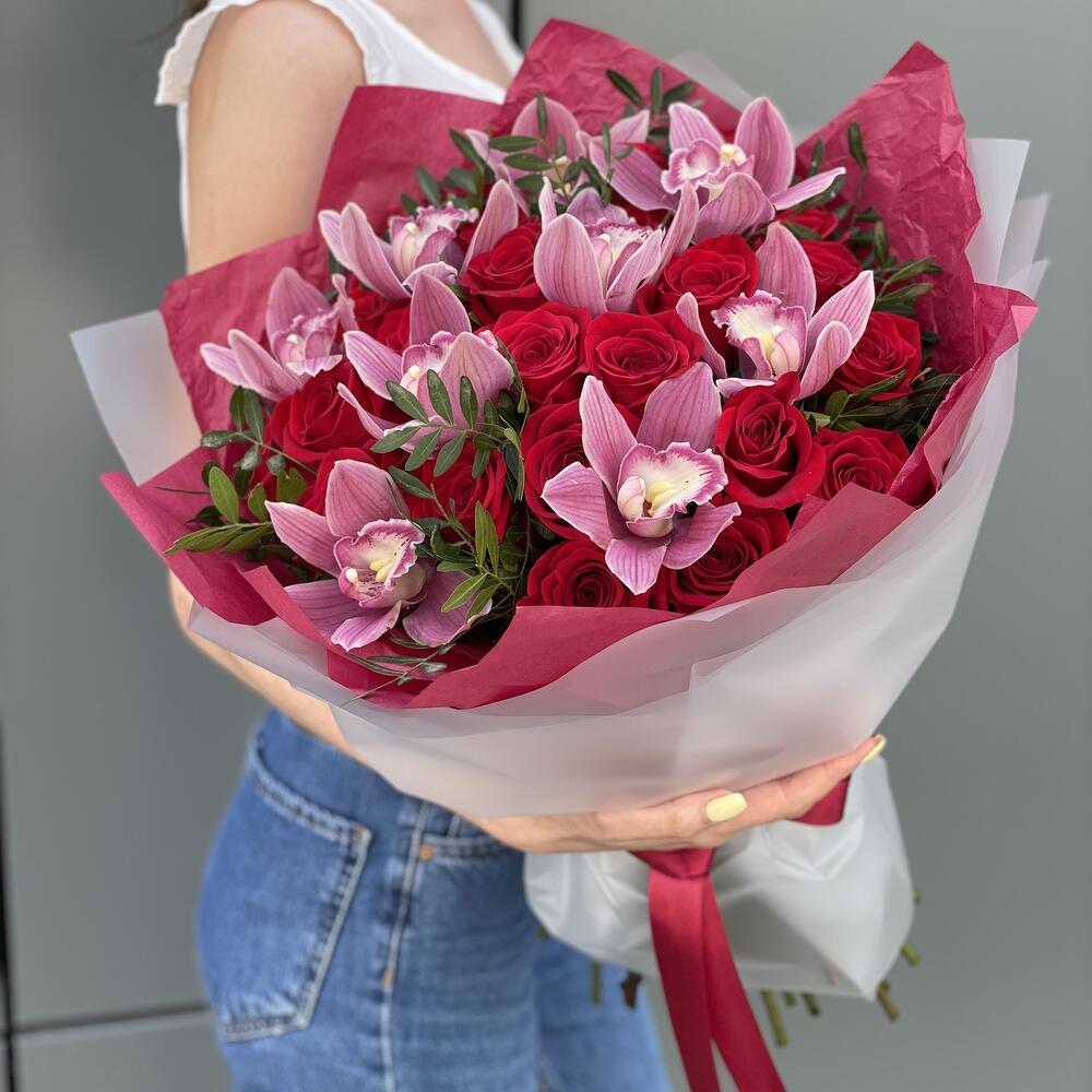 Букет из красных роз, цветков орхидеи и зелени в стильном оформлении!