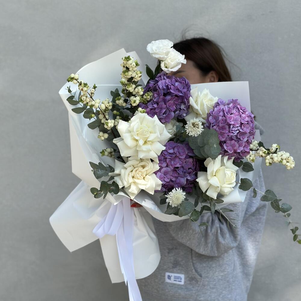 Гортензия – 3 шт. Симфорикарпус – 3 шт. Роза – 5 шт. Скабиоза – 2 шт. Эвкалипт – 4 шт.