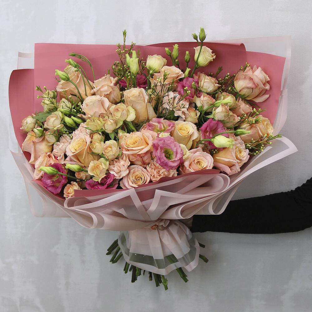 роза эквадор 60-70 см – 30 шт.Гвоздика – 10 шт.Лизиантус – 10 шт.хамилация – 5 шт.Пленка – 3 шт.Лента – 1 шт.