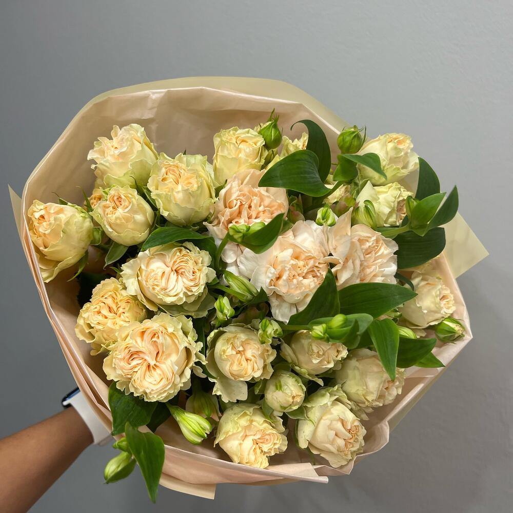 Кустовая пионовидная роза – 5 шт. Гвоздика персиковая – 3 шт. Авторская упаковка – 1 шт. шармелия – 2 шт.