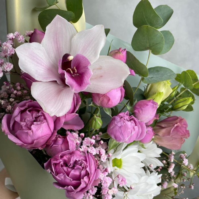 Гипсофила – 1 шт.Орхидея Цимбидиум – 1 шт.Хризантема кустовая – 1 шт.Эвкалипт – 2 шт.Роза кустовая пионовидная – 1 шт.Упаковка дизайнерская – 1 шт.Лизиантус – 1 шт.
