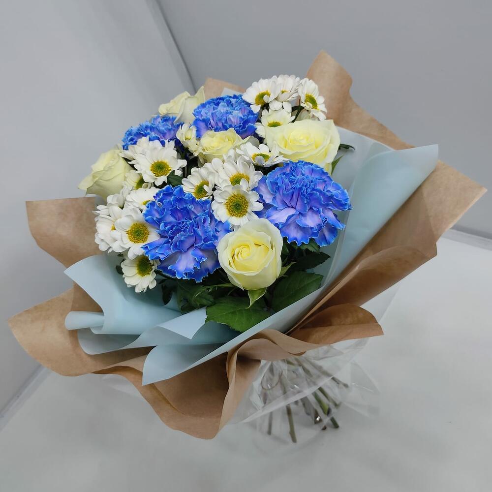 роза кения 40 см – 5 шт.диантусы голубые – 4 шт.Хризантема кустовая Сантини – 4 шт.Дизайнерская упаковка – 1 шт.