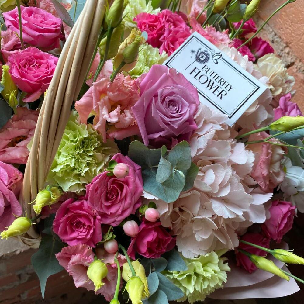 Корзина – 1 шт.Оазис – 3 шт.Гортензия – 1 шт.Фисташка – 4 шт.Эвкалипт – 4 шт.Гвоздика – 11 шт.Гиперикум – 11 шт.Роза кустовая – 5 шт.Роза – 5 шт.Эустома – 4 шт.Хризантема кустовая – 3 шт.Гиацинт – 1 шт.