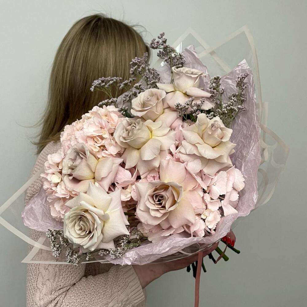 Гортензия – 2 шт.Лимониум – 2 шт.Роза – 7 шт.Упаковка дизайнерская – 4 шт.