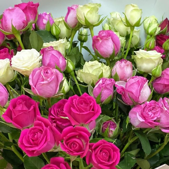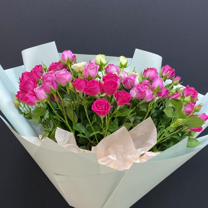 Лента – 4 шт. Роза кустовая – 15 шт. Тишью – 2 шт. Слюда упаковка – 2 шт. салфетка декоративная – 5 шт.