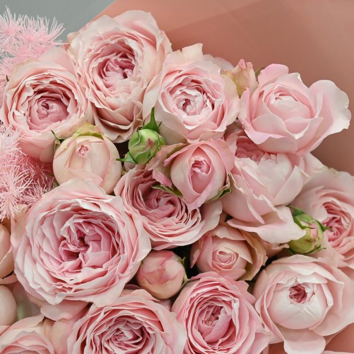 Роза кустовая пионовидная – 7 шт.аспарагус стабилизированный – 2 шт.Упаковка дизайнерская – 2 шт.