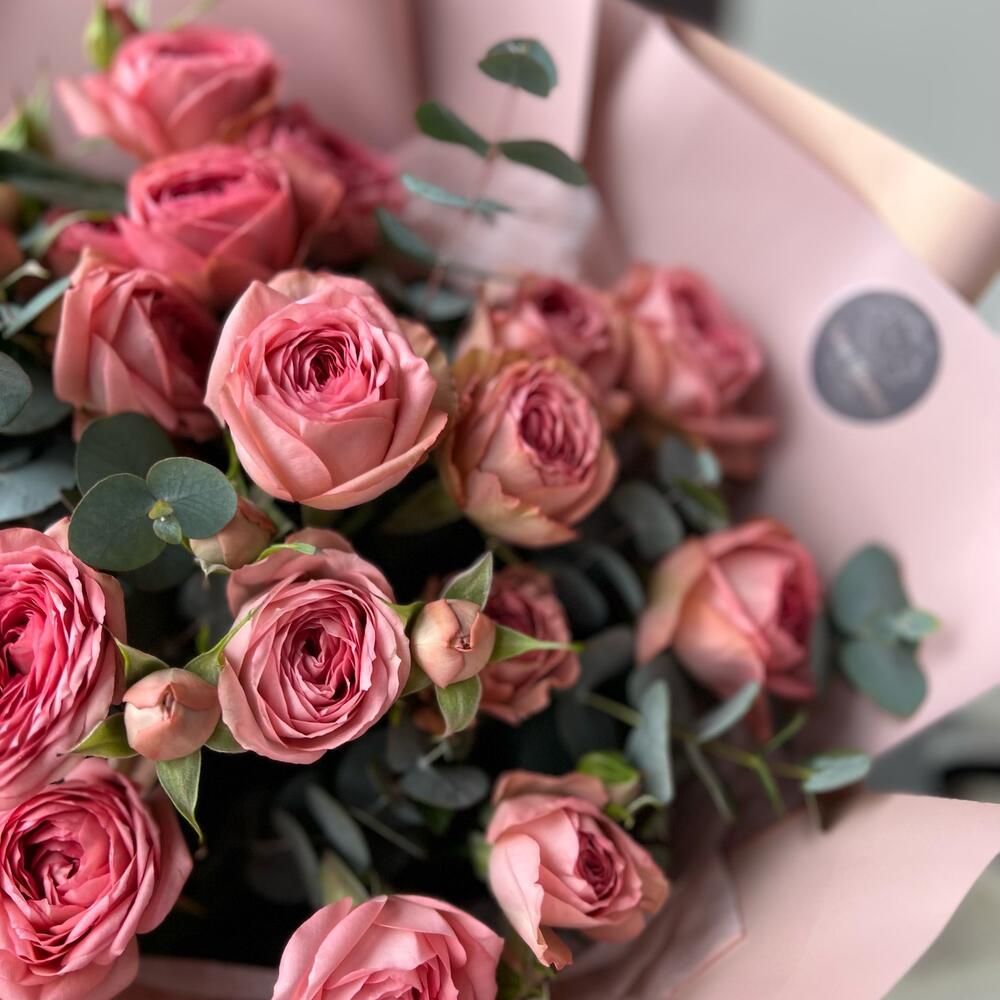 Букет из пионовидной кустовой розы и эвкалипт