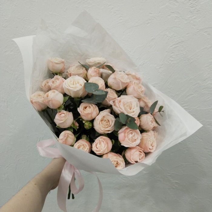 Роза кустовая пионовидная – 7 шт.Эвкалипт – 1 шт.Упаковка – 1 шт.