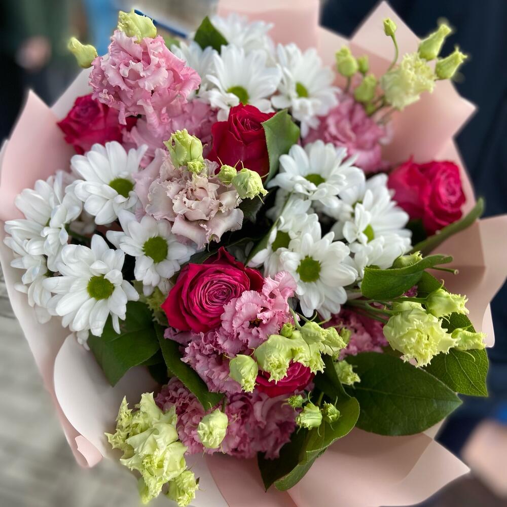 Букет из роз, хризантемы и махровой эустомы