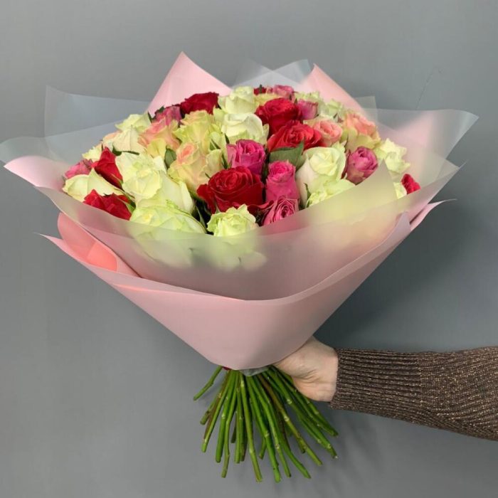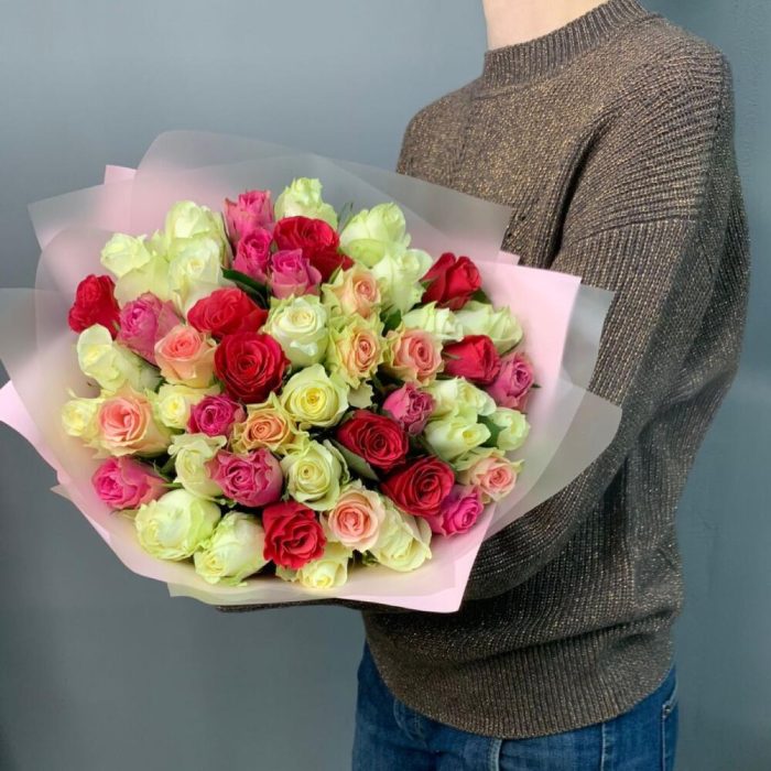 роза кения 40 см – 51 шт.Упаковка дизайнерская – 2 шт.Лента – 1 шт.