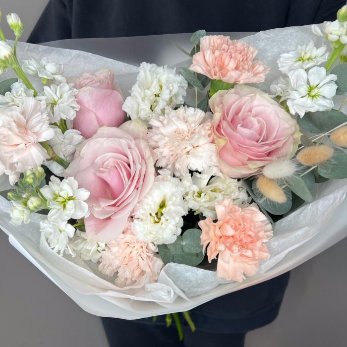 Лизиантус – 1 шт.Маттиола – 3 шт.Роза – 3 шт.Диантус – 5 шт.Упаковка дизайнерская – 1 шт.комплимент от polyanka – 1 шт.
