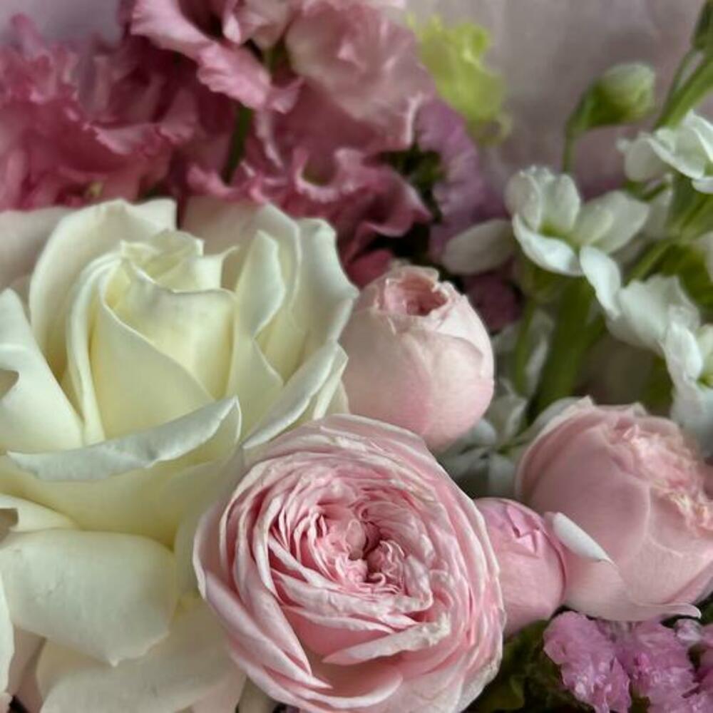 Маттиола – 1 шт.Статица – 1 шт.Кустовая пионовидная роза – 1 шт.Одноголовая роза – 1 шт.декоративная упаковка – 1 шт.Атласная лента – 1 шт.