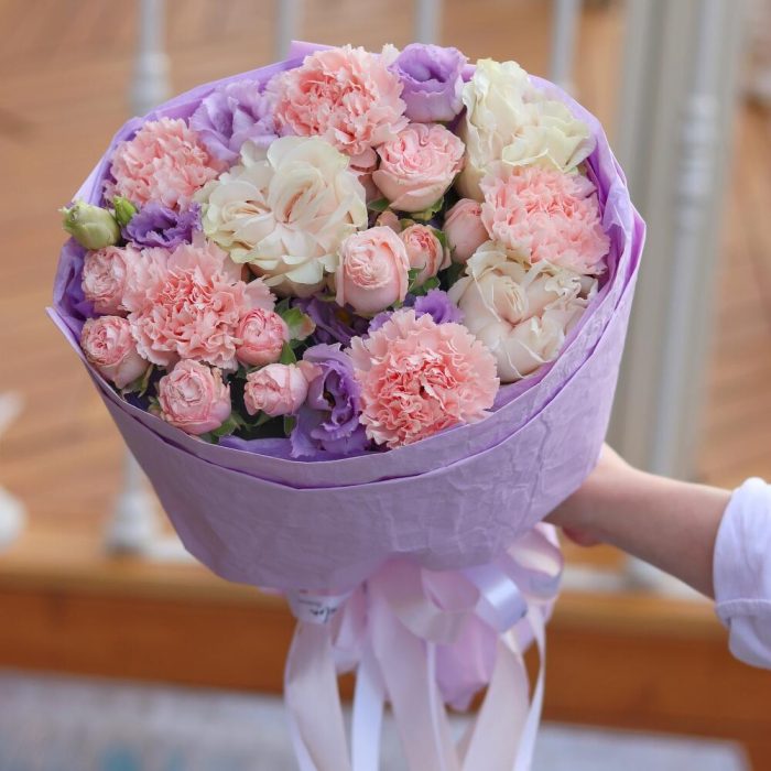 Роза пионовидная – 3 шт.Роза кустовая – 2 шт.Лизиантус – 2 шт.Гвоздика – 5 шт.Упаковка крафт – 1 шт.Открыточка с вашими пожеланиями – 1 шт.Шоколадка – 1 шт.