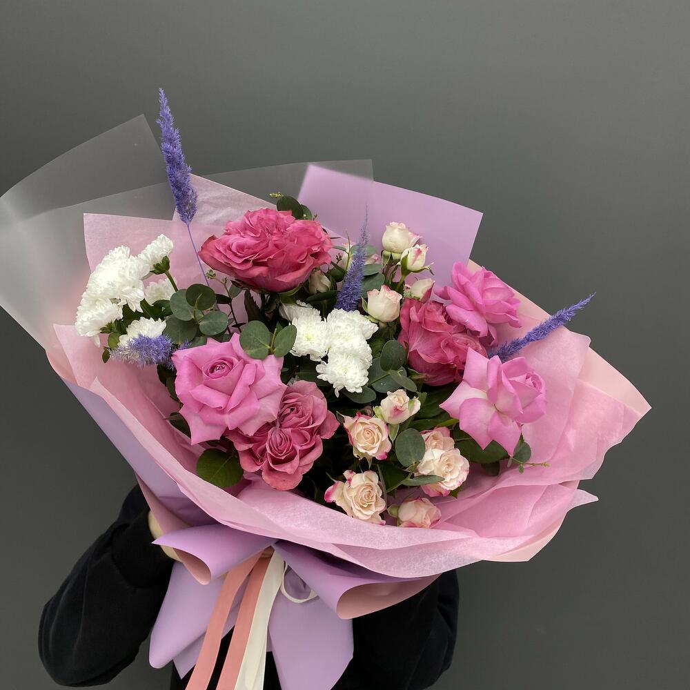 Альстромерии, Гвоздики, Кустовые розы, Лизиантусы, Розы, Хризантемы