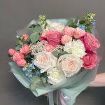 Роза Охара – 3 шт.Роза пионовидная розовая – 3 шт.Гвоздика – 3 шт.Бомбастик роза – 3 шт.Маттиола – 1 шт.Озотамнус – 2 шт.Оксипеталум – 3 шт.Эвкалипт – 3 шт.Упаковка дизайнерская – 2 шт.Лента атласная – 2 шт.