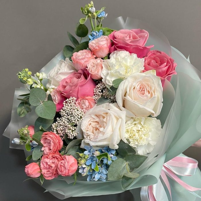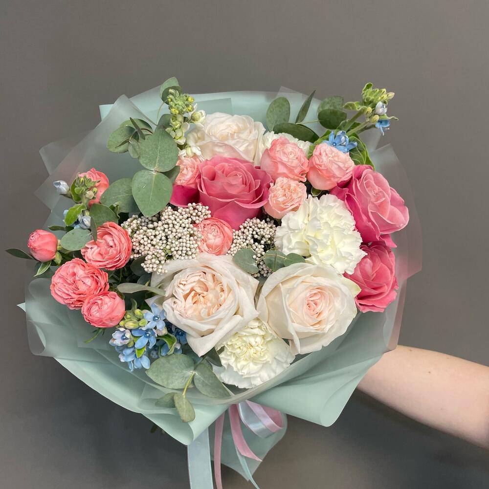 Роза Охара – 3 шт.Роза пионовидная розовая – 3 шт.Гвоздика – 3 шт.Бомбастик роза – 3 шт.Маттиола – 1 шт.Озотамнус – 2 шт.Оксипеталум – 3 шт.Эвкалипт – 3 шт.Упаковка дизайнерская – 2 шт.Лента атласная – 2 шт.