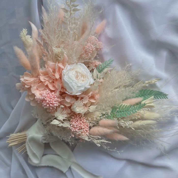 Лента органза – 1 шт.Лента шелк – 1 шт.Роза стабилизированная – 1 шт.гортензия стабилизированная – 1 шт.Лагурус – 14 шт.Нигелла – 1 шт.Озотамнус – 1 шт.пампасная трава – 1 шт.папоротник стабилизированный – 4 шт.Фаларис – 10 шт.Ковыль – 2 шт.Рускус – 3 шт.
