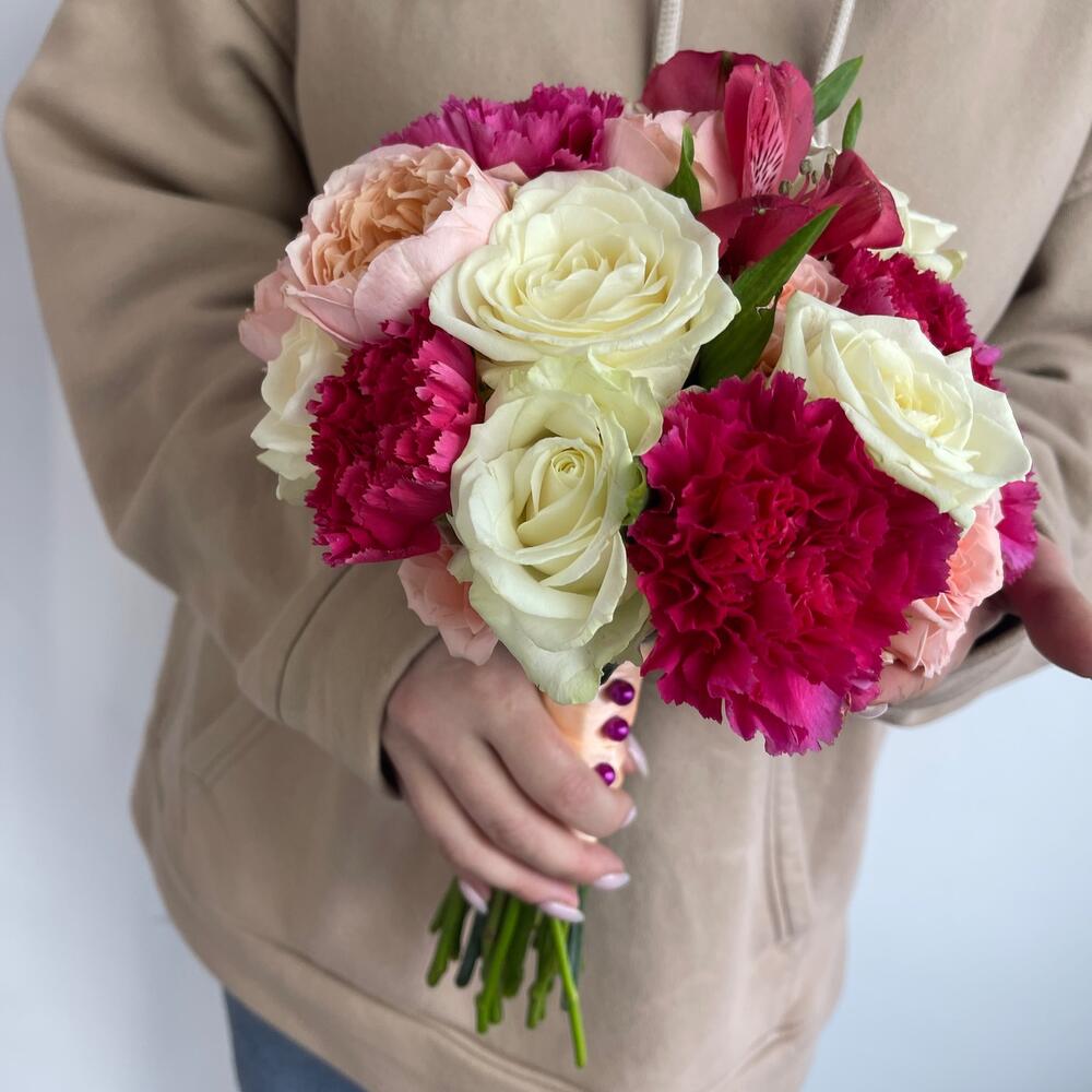 Кустовая роза – 5 шт.Диантус – 5 шт.белая роза – 9 шт.джульетта – 2 шт.