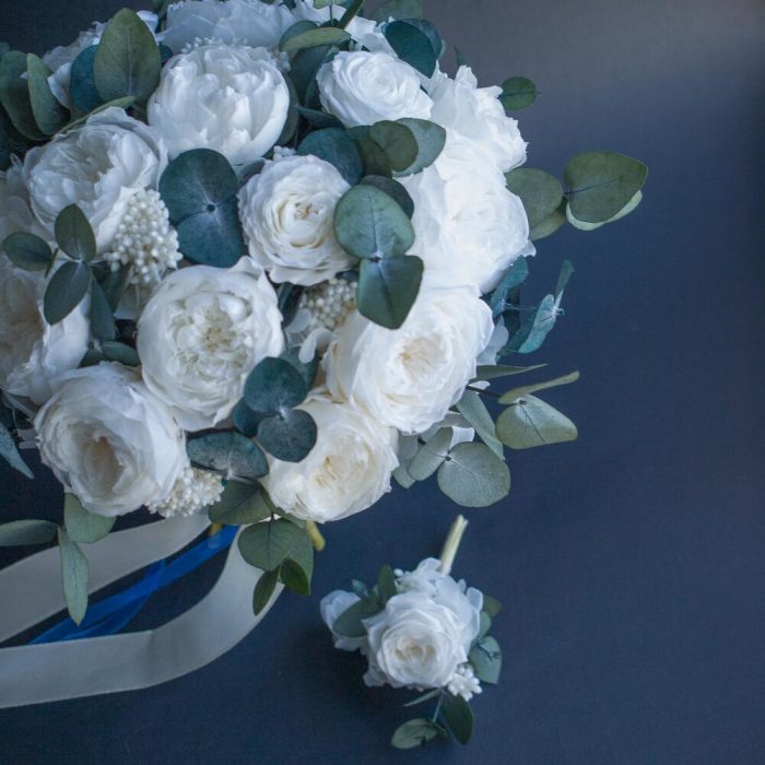 стабилизированная пионовидная роза – 17 шт.Эвкалипт – 20 шт.гортензия стабилизированная – 1 шт.