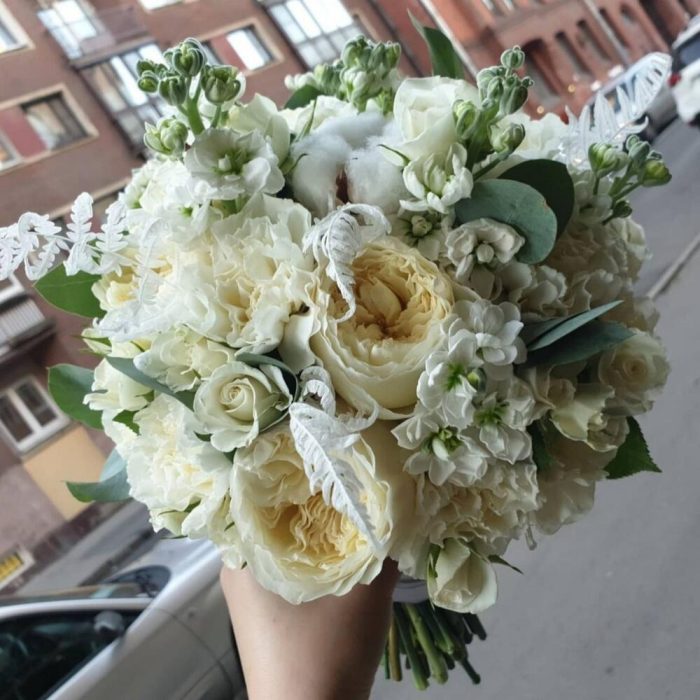 Хлопок натуральный – 3 шт.Роза пионовидная одноголовая – 9 шт.Маттиола белая – 7 шт.Диантус – 9 шт.Роза кустовая – 6 шт.Сухоцвет – 5 шт.Лента атласная – 3 шт.