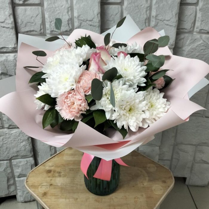 Эвкалипт Популус – 3 шт.Лента атласная – 1 шт.Хризантема кустовая белая – 3 шт.Гвоздика сортовая – 5 шт.Упаковка дизайнерская – 2 шт.Роза эквадор 50 см – 3 шт.