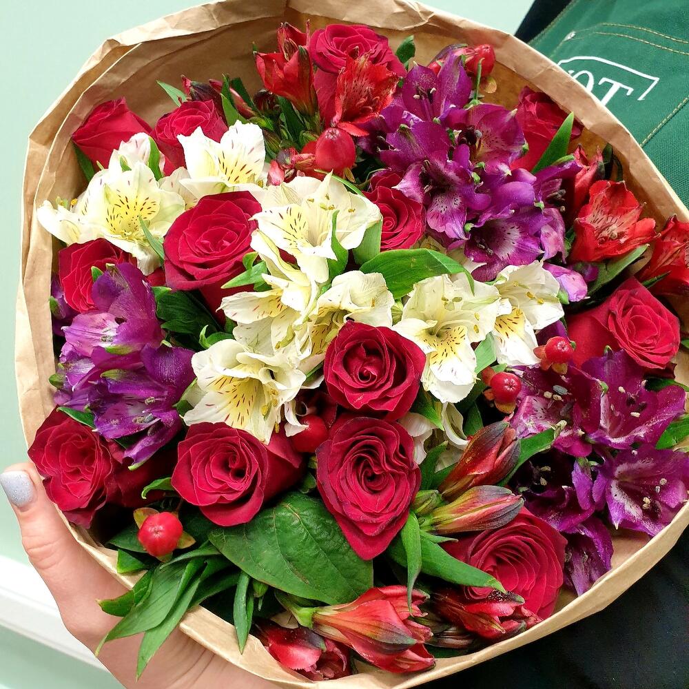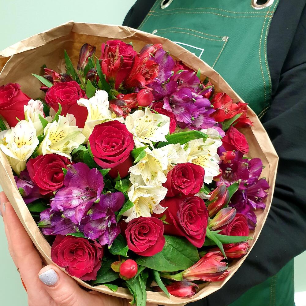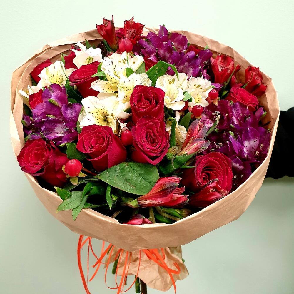 Альстромерия – 9 шт.Роза 60 см – 13 шт.Гиперикум красный – 3 шт.Упаковка дизайнерская – 1 шт.