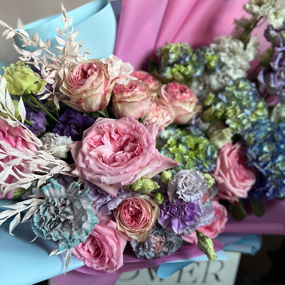 Категорий: Гвоздики, Гортензии, Лизиантусы, Пионовидные розы, Розы, Сухоцвет