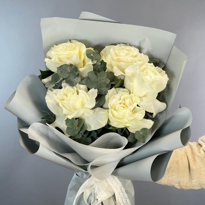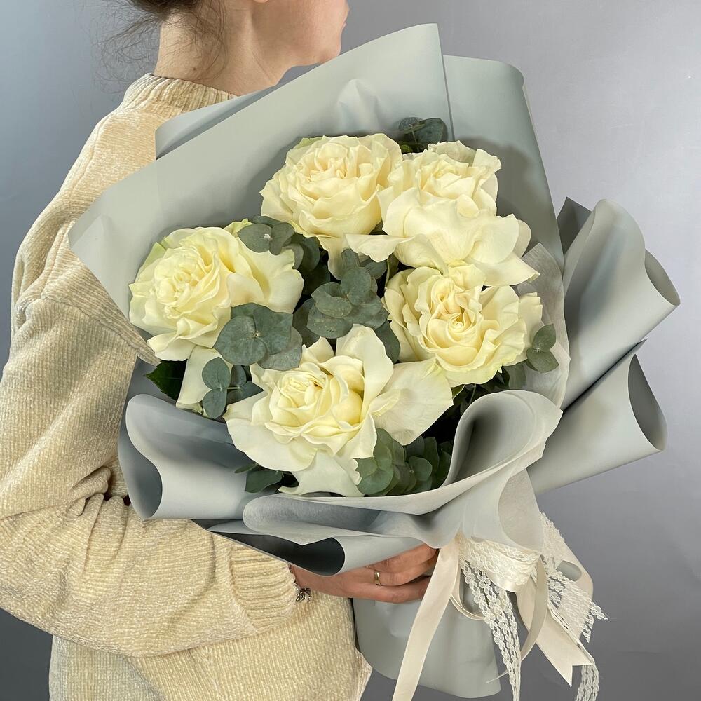 Роза одноголовая – 5 шт.Эвкалипт – 2 шт.Упаковка дизайнерская – 2 шт.Лента – 2 шт.